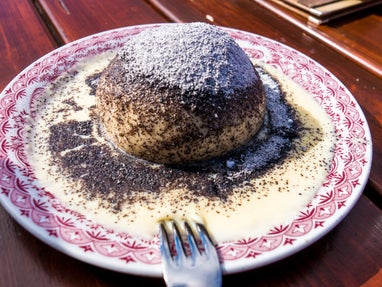 Germknödel-tradiční rakouský velmi oblíbený pokrm. Velký kulatý kynutý knedlík se plní povidly, posypává mákem s cukrem a ještě zalévá vanilkovým krémem. Jako by se spojily povidlové buchty a buchtičky se šodó….!